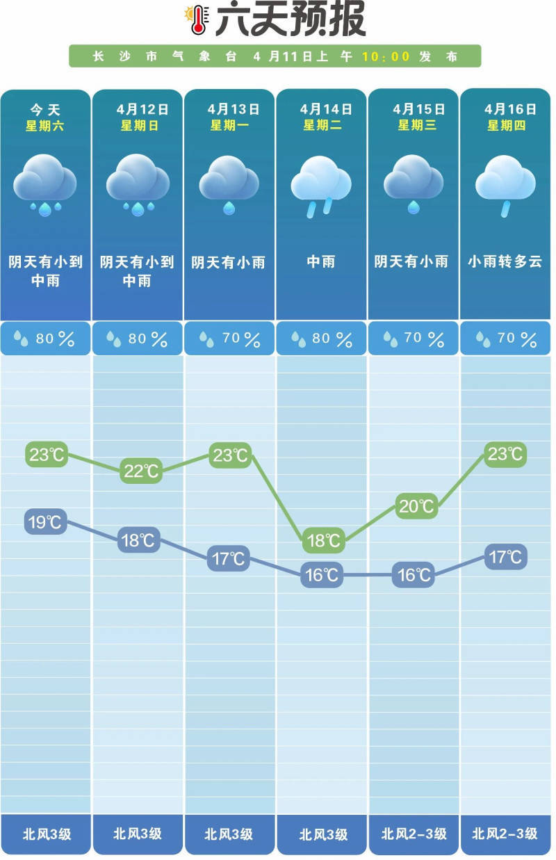 13日(下周一)同样阴天有小雨,17℃至23℃,早高峰上班记得提前出门,路面湿滑能见度低,开车骑车都要慢一点;14日雨势加大,长沙中雨,气温也有所下降,16℃至18℃;15日阴天有小雨,16℃至20℃;16日小雨转多云,17℃至23℃。接下来这几天降水概率都在70%左右,雨伞依然是出门标配。居家的话,湿度偏高,除湿机或者空调的除湿功能可以开起来。